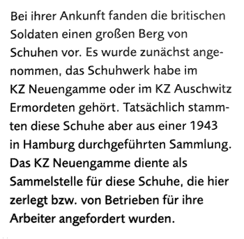 A S Marques has received an interesting photo from an Australian film maker of a mound of shoes at the Neuengamme concentration camp, Sunday, June 5, 2005. Gradually the wartime propaganda legends dissolve. ![]() Photo source: IWM -Imperial War Museum UK Holocaust "did happen" Sunday, June 5, 2005 Paul wrote to our correspondent A S Marques: Dear Sir, I read your remarks to David Irving about the piles of shoes in the camps. I am an Australian Filmmaker and 2 weeks ago I was filming in Neuengamme Camp and found an interesting Photo of a huge pile of shoes...I've attached it to this letter. The Caption to the photo [click for image] says: "British Forces entering the Camp [in 1945] discovered a large pile of shoes. At first it was assumed the shoes had belonged to those murdered in the Neuengamme or Auschwitz concentration camps. In fact these shoes were the product of a 1943 collection in Hamburg. The Neuengamme camp acted as a colelction point for these shoes which were taken apart here or requisitioned by factories for their workers." Marques replied: Thanks for your letter. Yes, it's quite interesting that a pile of shoes from Hamburg should be stored in the nearby camp of Neuengamme. One wonders where they might have been storing salvaged shoes from places like Dresden... A