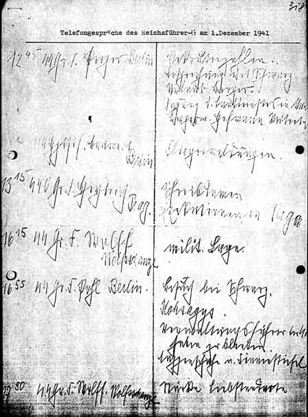 Telephone Calls with Heinrich Himmler, including to Reinhard Heydrich at 1:15 p.m. ("lady secretaries | executions in Riga"), December 1, 1941 A document first