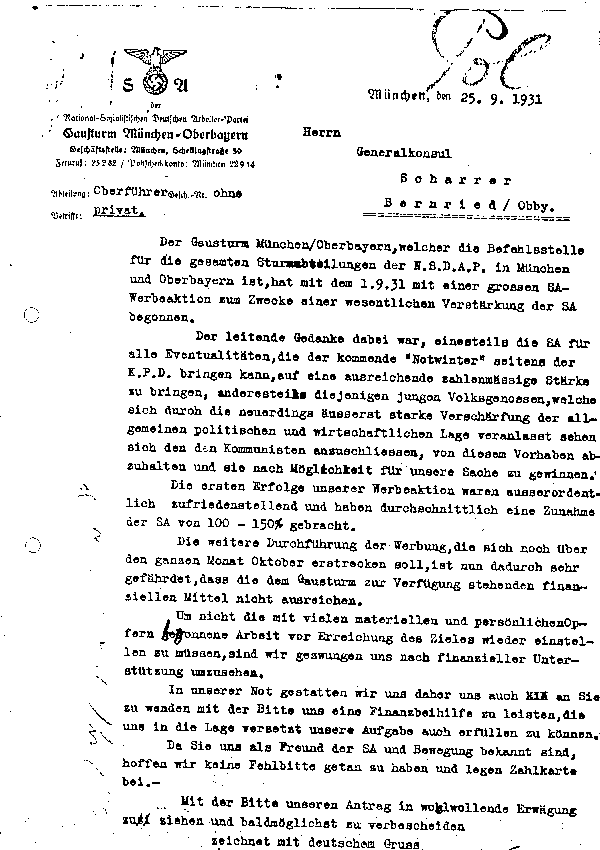 The NSDAP writes to Scharrer September 25, 1931