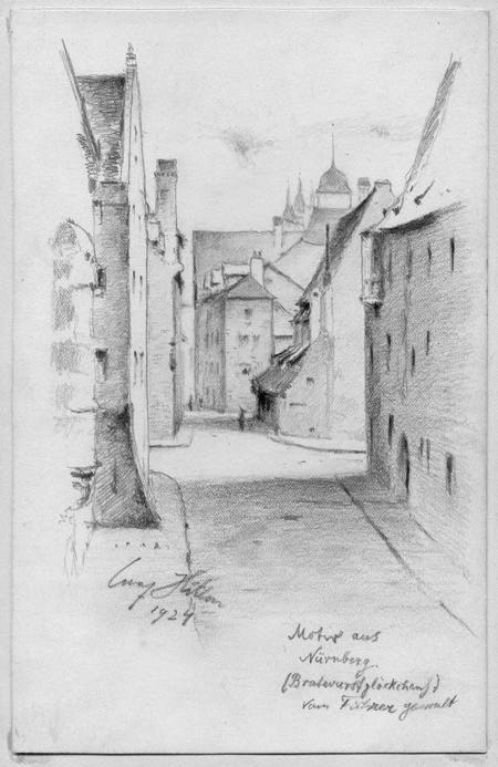 A genuine and very accomplished sketch of the Bratwürstglöckchen alley in Nuremberg, signed by Adolf Hitler in 1924Sold $7,500