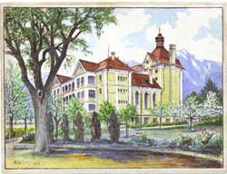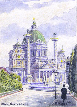 T. describes (Feb 2005): "These watercolors are authentic. Professor Gerdy Troost died in February 2003. Much of the estate had been sold to an American collector, but on a visit to Germany in June 2003, I saw 1930s furniture, books autographed by Hitler, Winifred Wagner, and Arno Breker; stacks of ink blotters used by Hitler, and letters and notes from him to Professor Troost including one written in late 1943, five or six pages long, discussing art. Amazing that while his world was collapsing, Hitler had the time and inclination to write about art! I purchased two very interesting bronze busts on marble bases; these were originally a set of six -- Hitler presented two to Troost. I have a photo showing one of them on a table in Hitler's apartment during the 1938 Munich conference. I also purchased an oil painting by a Norwegian painter, Christian Meyer Ross, that Hitler presented to her in the mid 1930s. In the Bavarian State Library are papers relevant to this painting in their Troost Collection, but some of it is closed until 2019. Hitler's painting of the Karlskirche (below) is a unique miniature; the one of the Hoftheater in Munich (above right) is simply superb and demonstrates vividly that the man had talent. | |