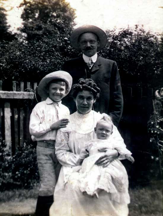 Headmaster John Irving in the garden at 36 Southfield Road, Oxford with (left to right) oldest son John J C Irving, Clara née Cawdell, Harry M N H Irving.