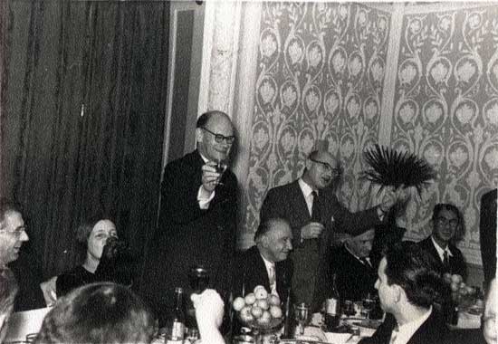 Professors Harry Irving and Piet Koltoff offer a joint toast at Soviet banquet after the conference