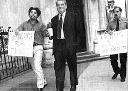 of Deborah Lipstadt harass Mr Irving as he enters the