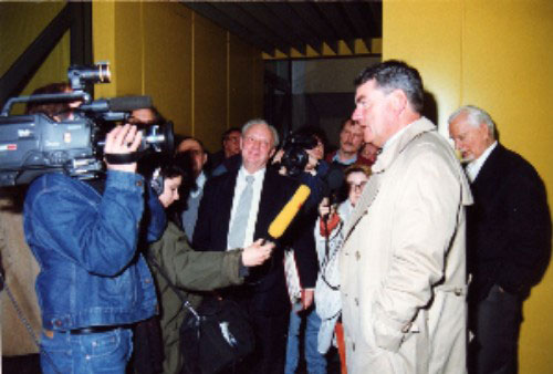 Filmed by German television after being fined 30,000 Deutschmarks by a Munich court in Jan 1993, Mr Irving repeats the allegations about a fake gas chamber building shown to tourists in Poland. In the center, his first lawyer Dr Herbert Schaller, behind Irving the WW2 Knights Cross hero Hajo Herrmann, his second attorney in the action.