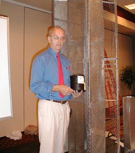Robert Countess with his fullscale model of the alleged wire-mesh Zyklon B introduction column.