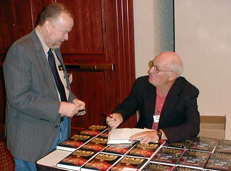 Kenneth Alford signs a book for fellow speaker Charles Provan