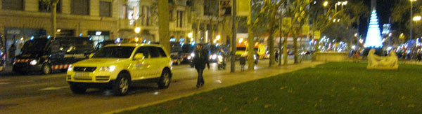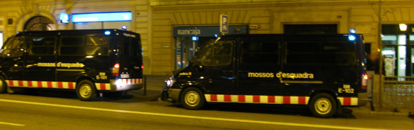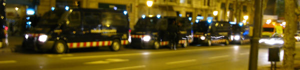 We arrive at Barcelona around five p.m. already very tired. A major football match with Madrid is beginning, but the police now have me on their hands. As we haul into the city centre I see once again waiting lines of police trucks near the speaking location, called in because of my arrival. We count eighteen of the trucks on one stretch of the Paseo de Gracia boulevard alone. The police are once again cordoning off the area where I am to speak.