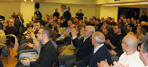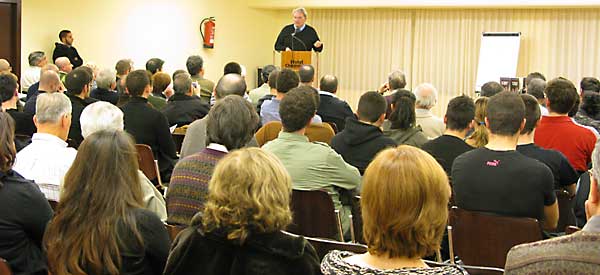 We get to the evening's Madrid location at five pm. It is now 2,920 miles since we left London. A large crowd is already pouring in. I count 270 chairs, and most are filled. The audience is very friendly, and after a lengthy introduction by Pedro, with the usual scary ranting about the Jews, the economic crisis, and Zionists -- why cannot he learn to tone down his remarks! -- I enter to a pleasing ovation and speak for about an hour.