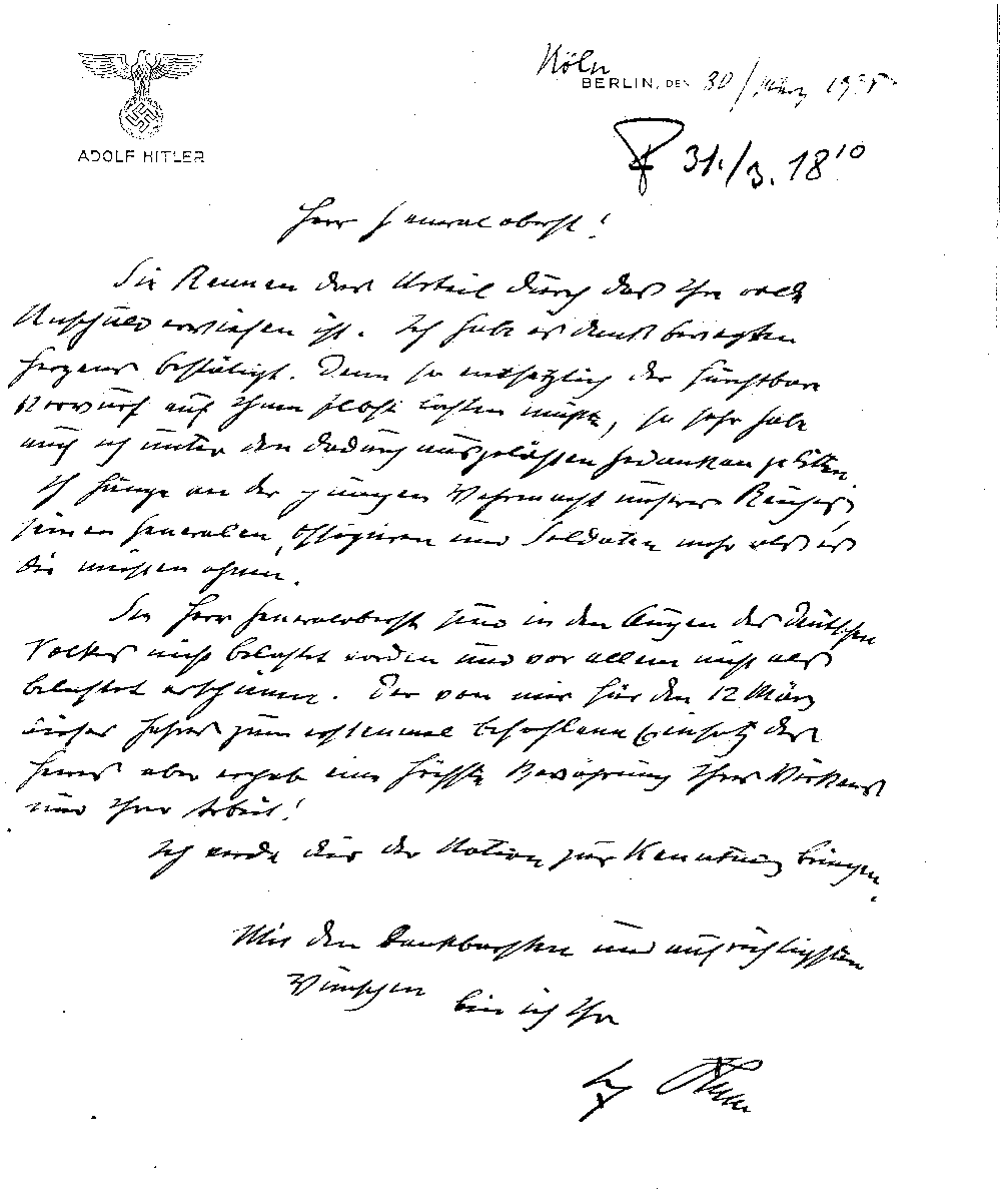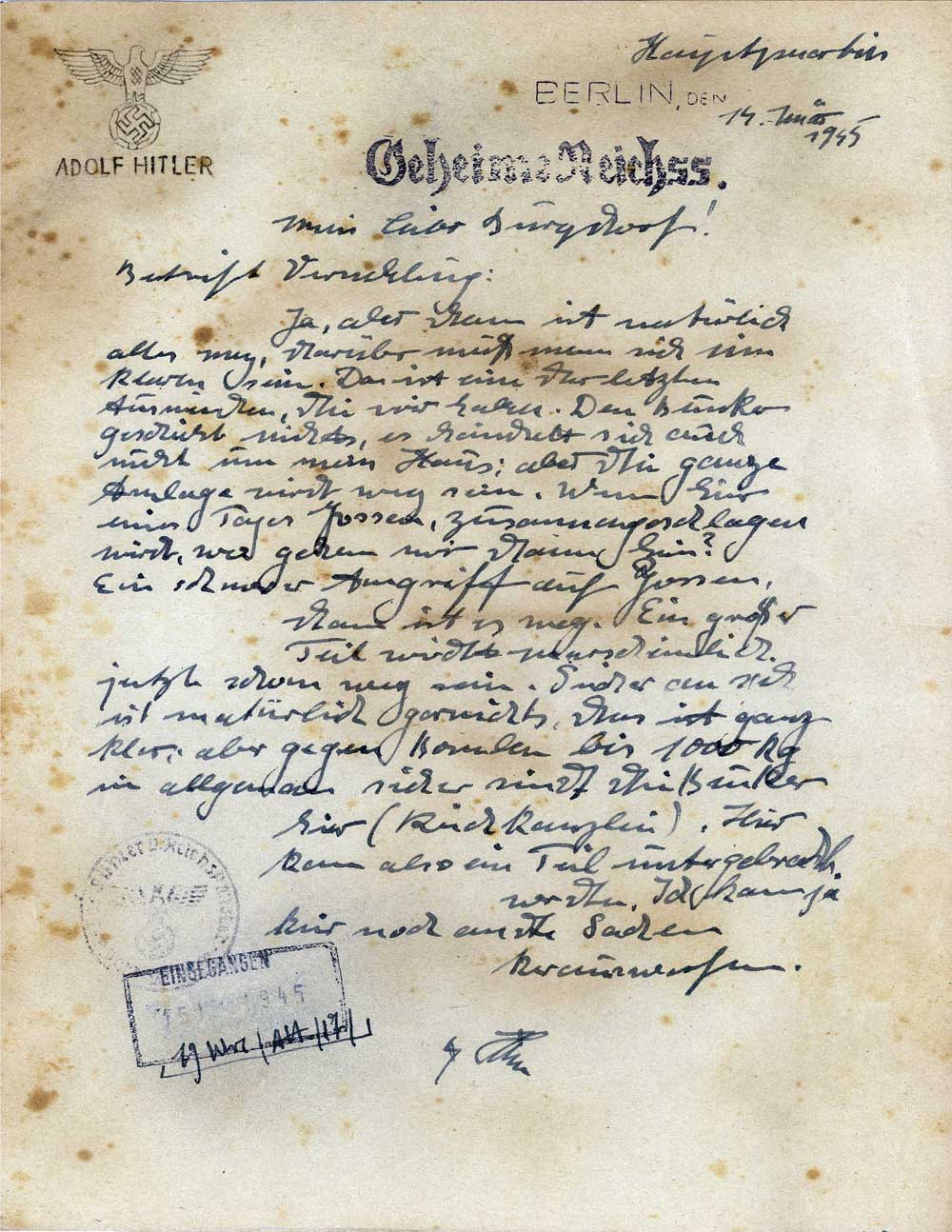 THERE is no obvious reason why a 1945 letter from Hitler to Burgdorf, an army general, would pass through an SS agency, let alone two (there is a faint stamp on the verso, SD-Hauptamt, I think). The paper is not even A4-size, but it is yellowed and stained.