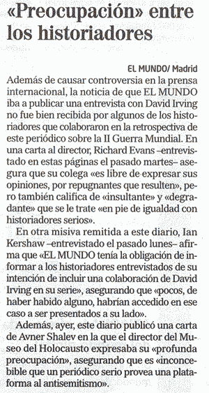 In another letter sent to this newspaper Ian Kershaw - interviewed last Monday - asserted that "El Mundo had the obligation to inform the other historians being interviewed that they intended to have David Irving participate in the series," asserting that "few if any would have agreed in this case to be presented at his side."