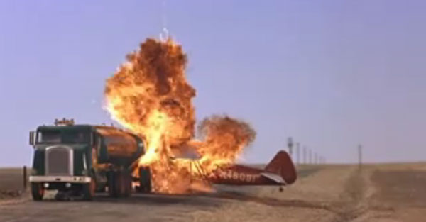 One detail causes me to pause the film and rewind: yes, there it is. After the famous scene of the sinister cropduster biplane smashing into the oil tanker on the lonely, arrow-straight prairie highway somewhere near Bakersfield, Cary Grant confronts Eve Kendall and there is a glimpse of her local newspaper on a table: TWO DIE AS CROP DUSTER PLANE CRASHES AND BURNS, reads the headline: TRUCK DRIVER ESCAPES HOLOCAUST. Do my eyes deceive me? I rewind a few seconds. Yes, there it is: HOLOCAUST.
