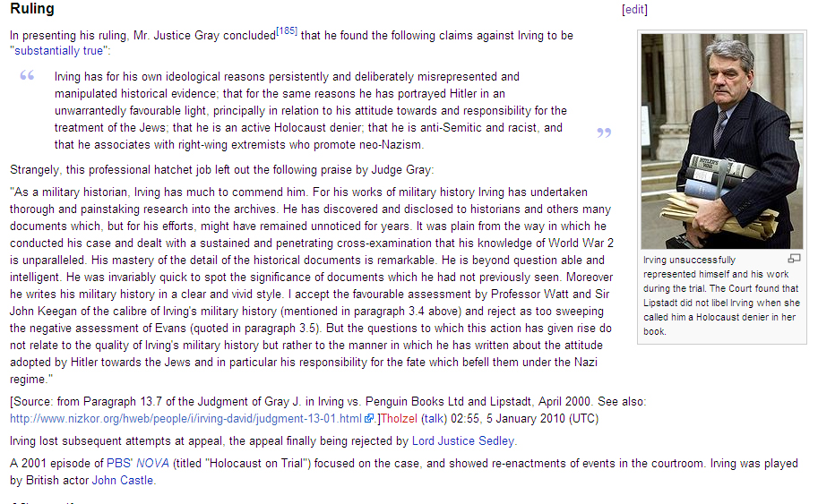 The entire sorry tale is available for viewing at: http://en.wikipedia.org/wiki/Talk:David_Irving#Hints_of_religious_bias_haunting_this_page