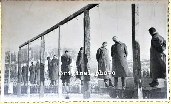 Postscript, Sunday, April 3, 2011: Ivor Lough of London, UK, informs us: "The Russian photos are of a mass execution of artillery officers of, I believe, the German 2nd Artillery Regiment that shelled Leningrad while it was under siege during the War. The trucks in the background were used to transport the prisoners to the site; while in the trucks they were hooked up to the gallows, and then the trucks drove off; this was all filmed and shown as newsreel to the world in, I think, 1946. Regards Ivor Lough."