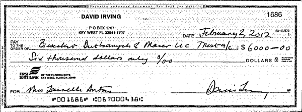 ON DECEMBER 10, 2011, a few days after she resigned, David Irving mailed two blank signed checks to former colleague Mrs Jaenelle Antas to settle any residual indebtedness for pay and business disbursements. Not having received or banked these before she left the USA for Australia, she stated a properly itemised claim via an arbitrator, Indianapolis attorney Andrew Dutkanych* who wrote Mr Irving on December 20. Mr Irving duly mailed to his law firm the above check to be held in trust for her subject to certain provisos. He had also credited over two thousand dollars to her by a direct route. These two payments, which were voluntarily made, vastly exceeded her total claim because, as Mr Irving stated, he did not want his valued former personal assistant to be without funds in her new country. The law firm cleared the above check on February 9, 2012, Jaenelle met the provisos, and on February 14 Mr Irving wrote the law firm: "We herewith authorise immediate release of the funds held in trust to your client in full and final settlement of her claim." Challenged now by Mr Irving, the law firm - which has a fiduciary obligation toward him - has refused to provide even the simplest evidence that they ever forwarded to Mrs Antas the above funds, or any part of them, which they held in trust for her. Thursday, May 17, 2012