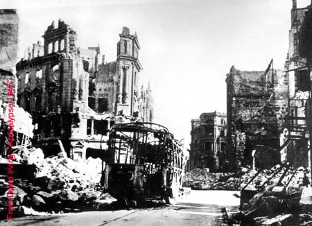 DESCRIPTION: A ruined streetcar teeters crazily in the city's ruins, photographed months later