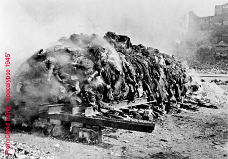 DESCRIPTION: Remains of air raid casualties are gathered up for identification and open air cremation in Dresden's Altmarkt square, Feb 25, 1945