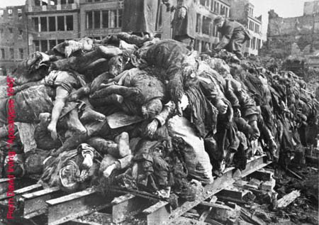 DESCRIPTION: Troops heap up the bodies on makeshift pyres, trampling them down to make room for more