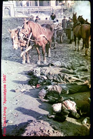Remains of air raid casualties are gathered up for identification and open air cremation in Dresden's Altmarkt square, Feb 25, 1945